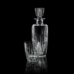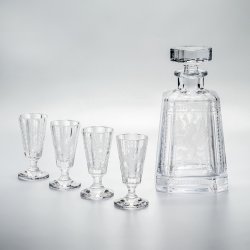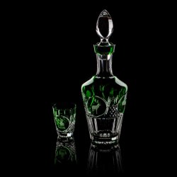 A classic design that is mouth-blown and hand-cut with hand painted 24K matte gold decoration. A set includes a vodka decanter and four coloured vodka shot glasses.