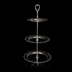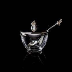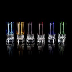 A silver-plated round tray decorated with wooden handles. The set includes mouth-blown, hand-cased Ice Shots set of 6, Caviar Bowl & Vodka Decanter colored.