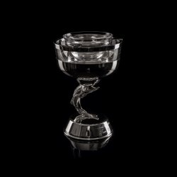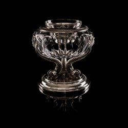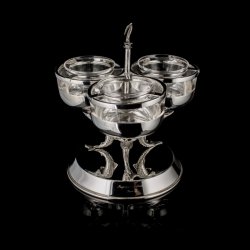 The server is made of sterling silver. Consists of a mouth blown, black cased crystal vodka decanter, two vodka shots and an individual caviar bowl.